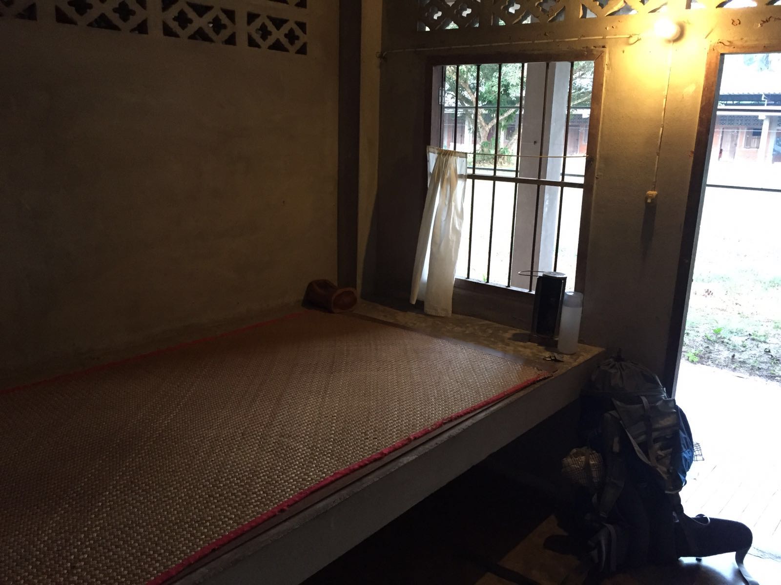 Anschließend bezogen wir unsere Zimmer. Jeder bekam eine Strohmatte, ein Holzkissen, eine Decke und ein Mückennetz zur Verfügung gestellt. Alles was man braucht lernten wir. Die Zimmer sind natürlich spartanisch, jedoch ist es wiederum auch Luxus eine Einzelunterkunft zu haben, in der man sich zurück ziehen konnte, wenn es der enge Zeitplan erlaubte. Auch das Betonbett wird Dank des anstrengenden Tagesablaufes zur gemütlichen Schlummerstelle, auf der man gern noch verweilen möchte, wenn pünktlich um 4 Uhr am Morgen und ohne Erbarmen der "Gong" der großen Klosterglocke ertönte.